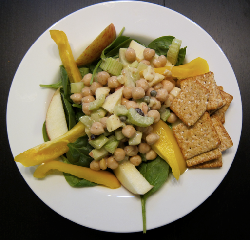goddess garbanzos are quick, easy, and healthy — and they make a nice dinner topping a salad (with an obligatory side o’ carbs). i added raisins for a touch of extra sweetness.