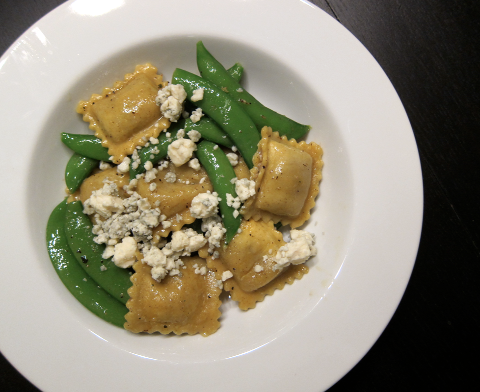 rising moon portobello ravioli with snap peas, gorgonzola, and truffle salt