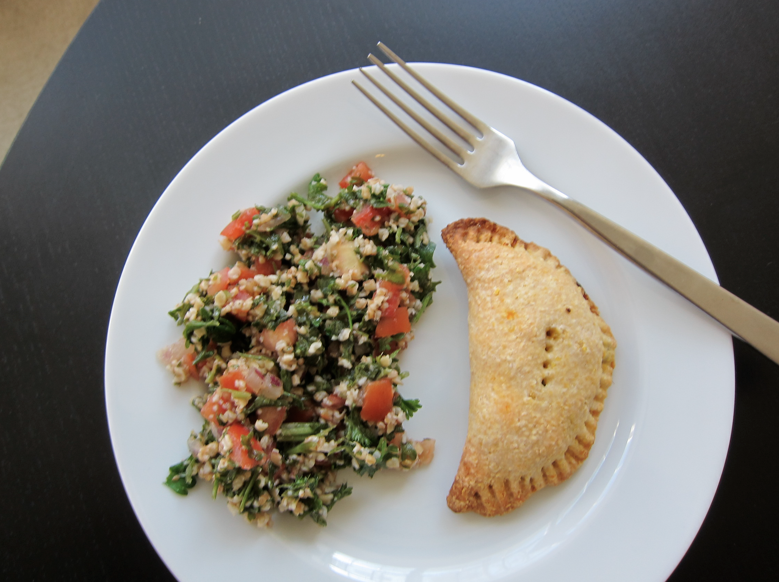 leftover homemade sweet potato samosa + tabbouli (actually a wimpier lunch than usual)