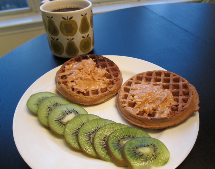 2 whole grain waffles w/ almond butter + kiwi + black coffee (yep all caf . . . )