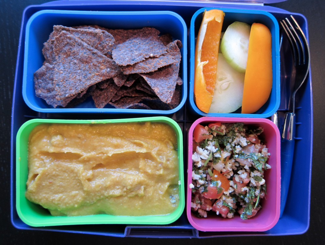leftover sweet potato/chickpea soup + blue corn chips + veg + tabboli in the laptop