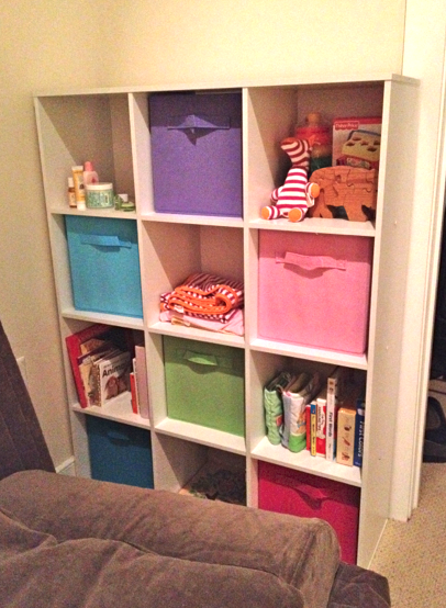 finally some organization in the nursery! nothing fancy, just a closet maid cube unit from target — but now that toys and books aren’t strewn everywhere, the place looks much nicer.