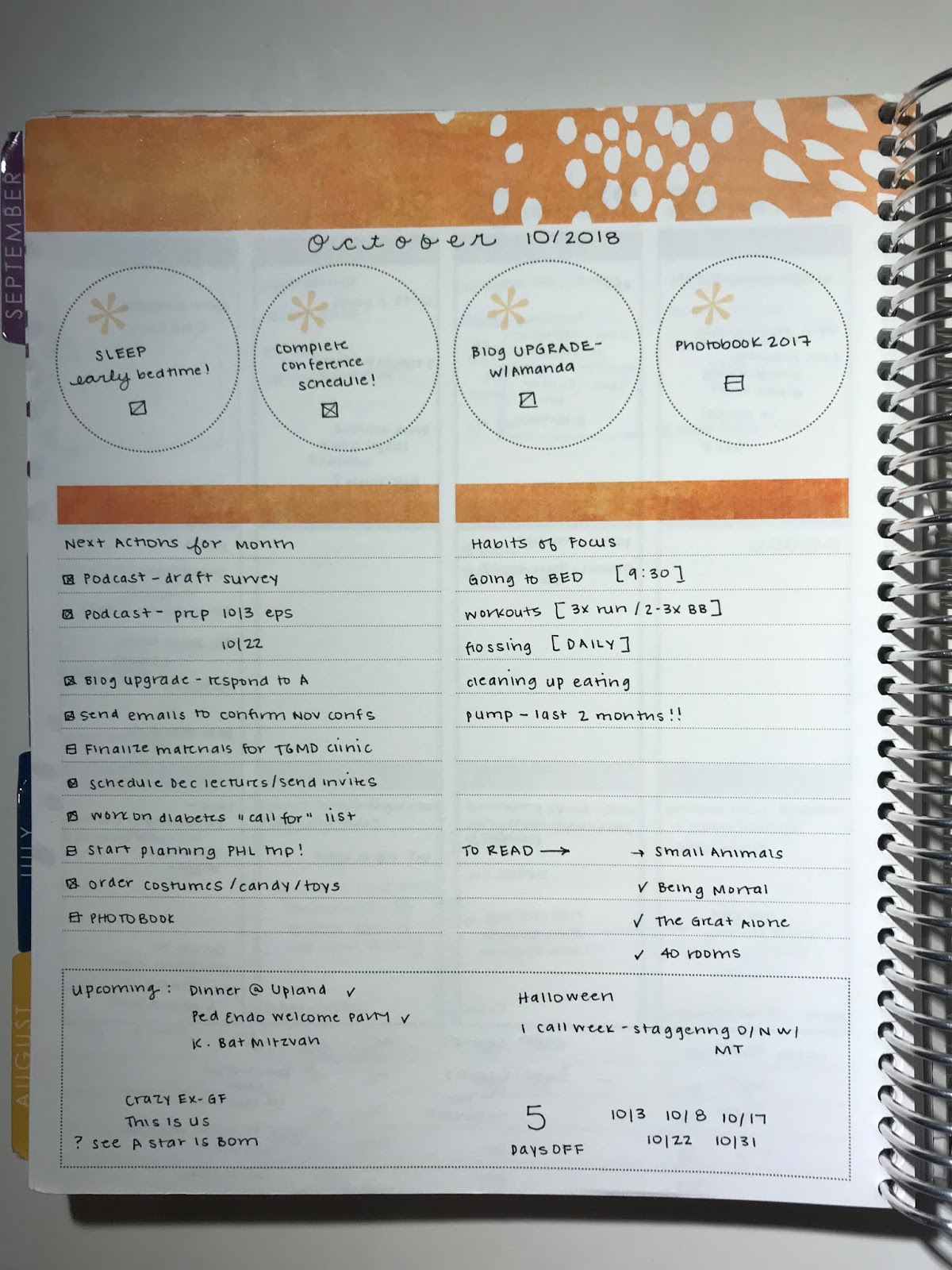 I even like the pages present each month to list plans/goals (even f I don’t like the design – what are those annoying white flower petal looking things!?!). I have used them to identify my big goals and habits of focus for each month. Here was October: