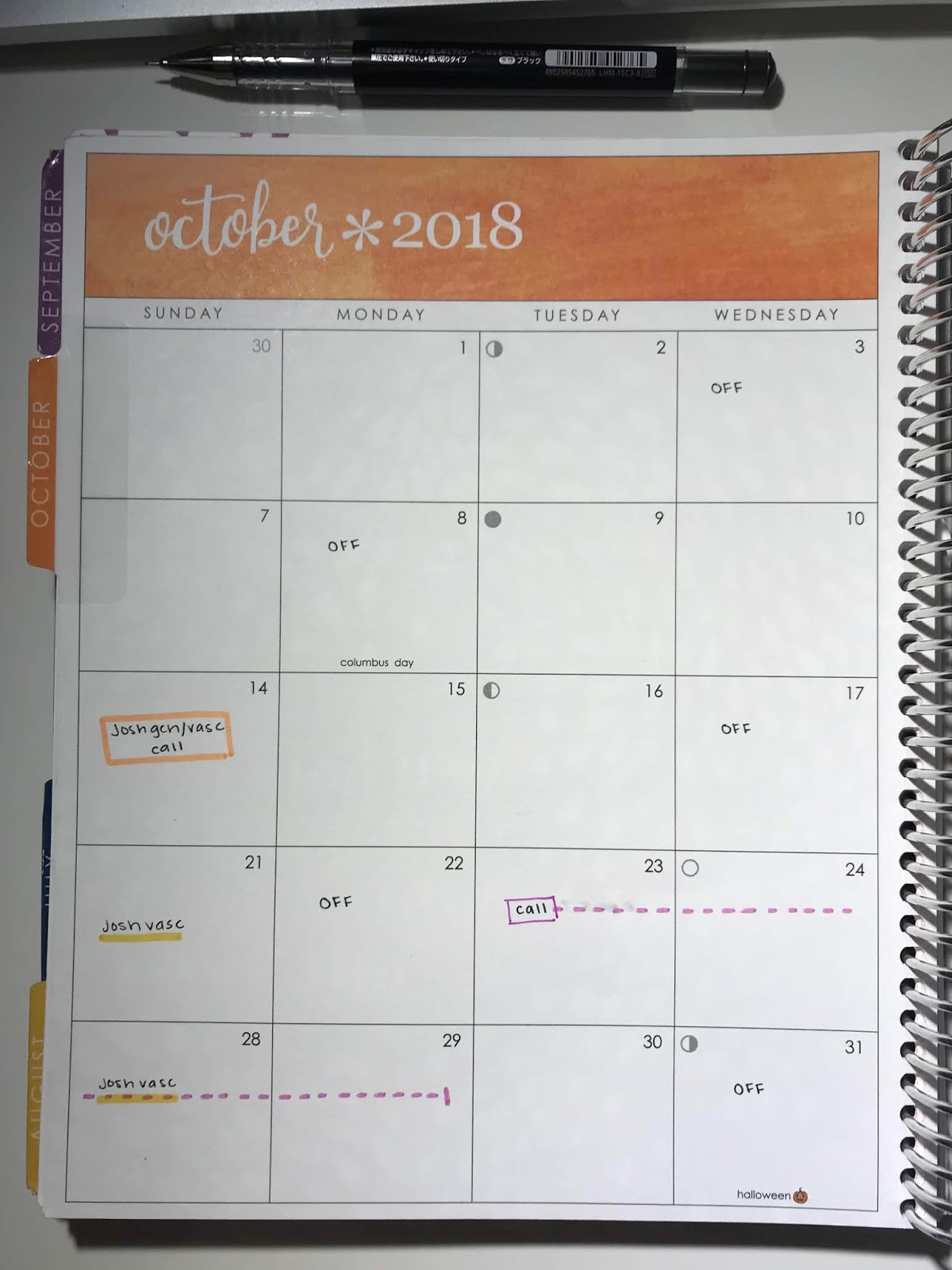 The monthly pages are nice and wide, spread on 2 pages — you could do MUCH more than I do with these pages (I mainly use them for call schedules/big picture things). They are roomy enough to be workout trackers, main calendar planning pages, anything really!
