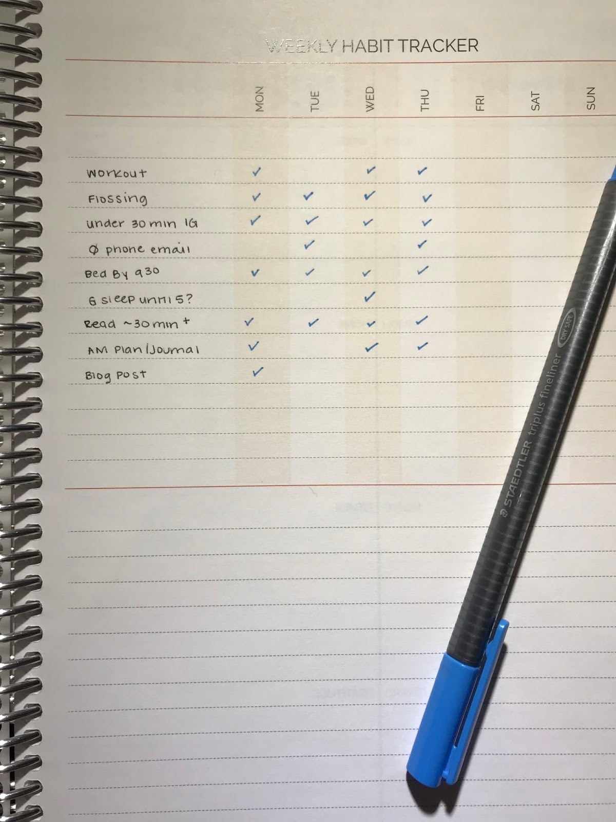 For fun, I included a tracker page after each week! Here’s the tracker for this week so far: