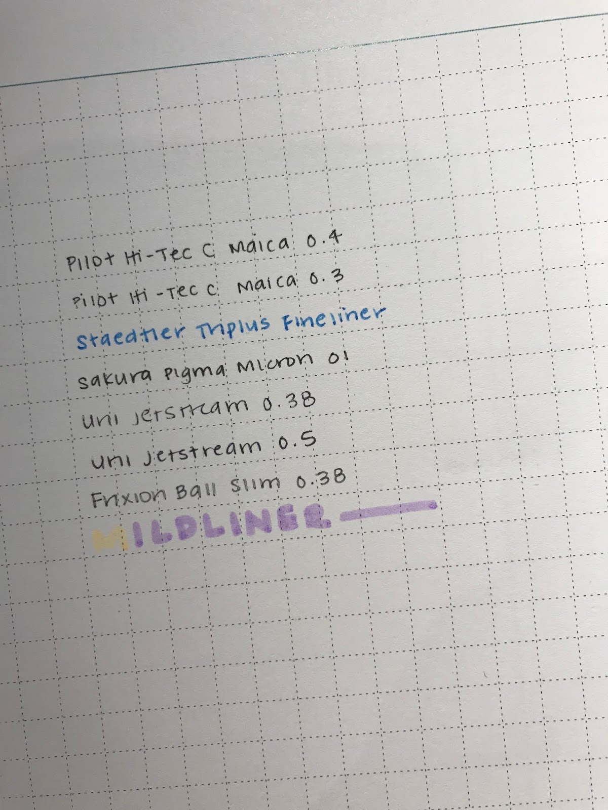 Pen test! For those of you curious about pens I prefer, here’s what I have in my drawer currently! The top one is my absolute favorite currently. This paper has low smear potential, for my left-handed (or otherwise smear-conscious) writers.