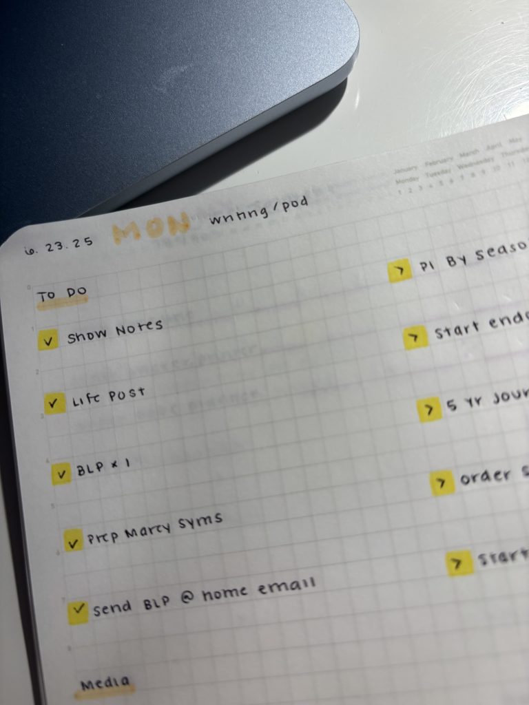 I will preface this to say I have absolutely no answers to your conundrum, but after reading this, I’d like to just commend you on how much you are doing! There simply isn’t enough time to do EVERYTHING, and you’re doing a lot. How did you accomplish those family admin items when you were 4-5 days in clinic? Back then, you just (not in a condescending way, more so in comparison) had your podcast for your creative work, and now you’ve added on a lot- a whole book, courses, a LIVE event, etc. It’s a lot and all of that takes time. With your creative work, yes there is probably more flexibility than your clinic work, but it’s still more than a full-time job. And if you were working FT in clinic, you’d probably take PTO to attend to those admin items – doctors appointments, kid conferences, etc So likewise, you’re taking PTO from yourself to attend those items during your creative time. And there honestly isn’t enough time. So definitely give yourself some grace – you’re doing a lot and accomplishing a lot! You’ve really expanded your creative work a lot than say, 5 years ago, and be proud of yourself! That’s amazing!! However, here are some suggestions that might be helpful: