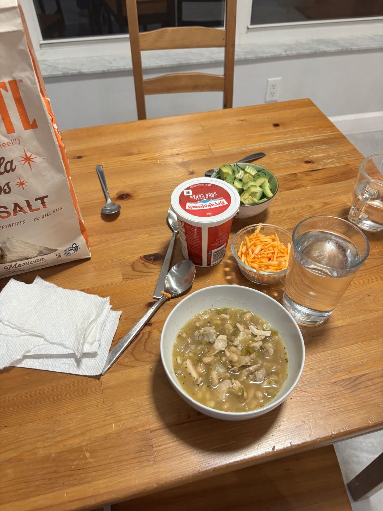 We had white chicken chili last night! Ours was a meal that was dropped off by friends shortly after my accident so all I had to do was put it in the crockpot and shred the chicken breasts before eating. It was so good!