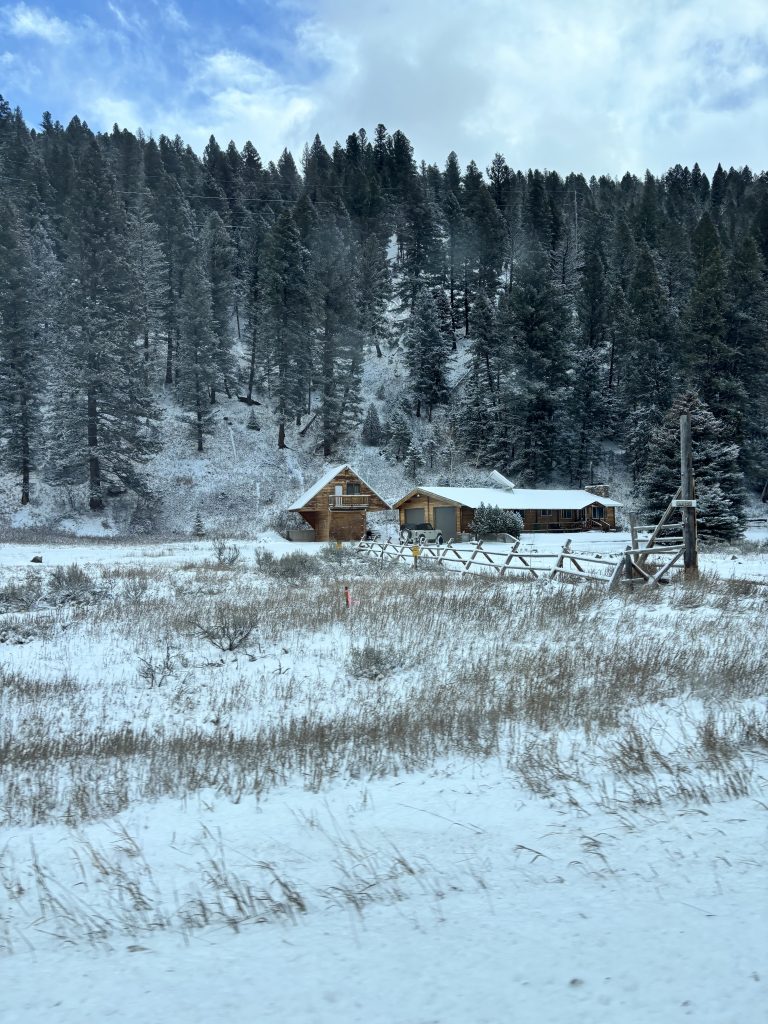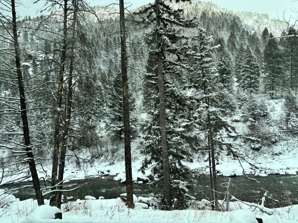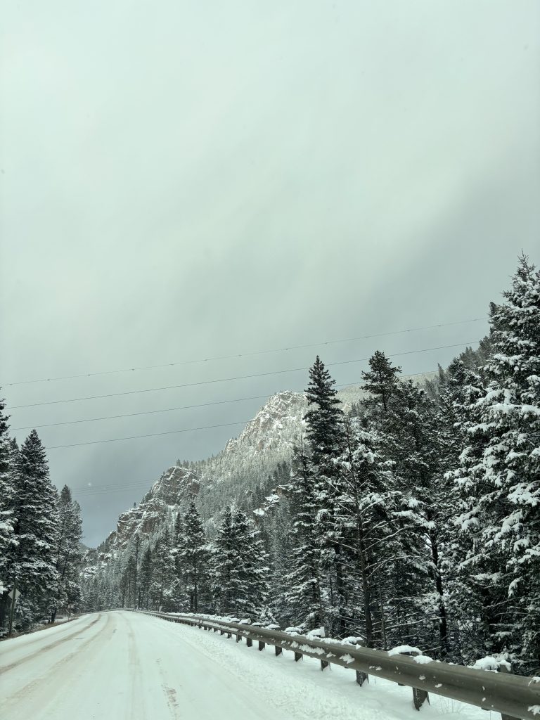 We stopped at the shops where I bought my 3rd Big Sky T-shirt (I guess it’s a collection now) and G got an awesome fleece blanket with the trail maps on it. Then we headed out to Bozeman — in the snow! It took about 90 minutes instead of the usual ~70 but the scenery was gorgeous.