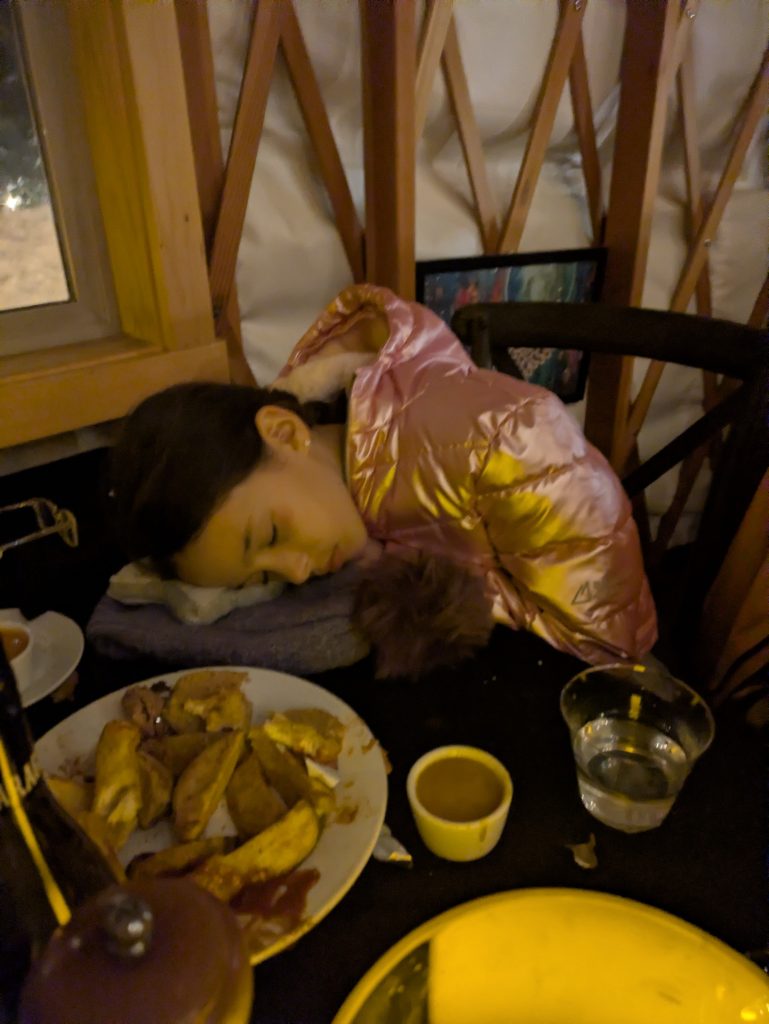 What a cute picture of G passed out at dinner. Skiing sounds so fun. It’s nice to have an active hobby with the whole family.