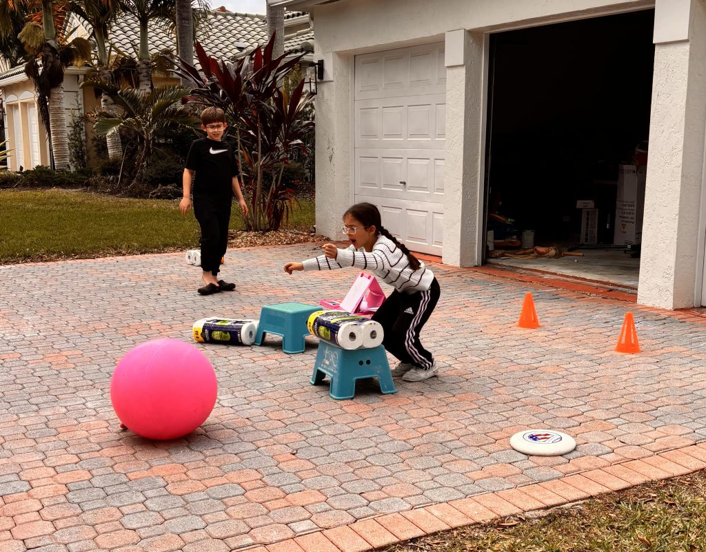 I came home from dropping A off (only takes 15 min total so I felt fine leaving these two) to see this “obstacle course” being built in our driveway. (Josh is working this weekend).