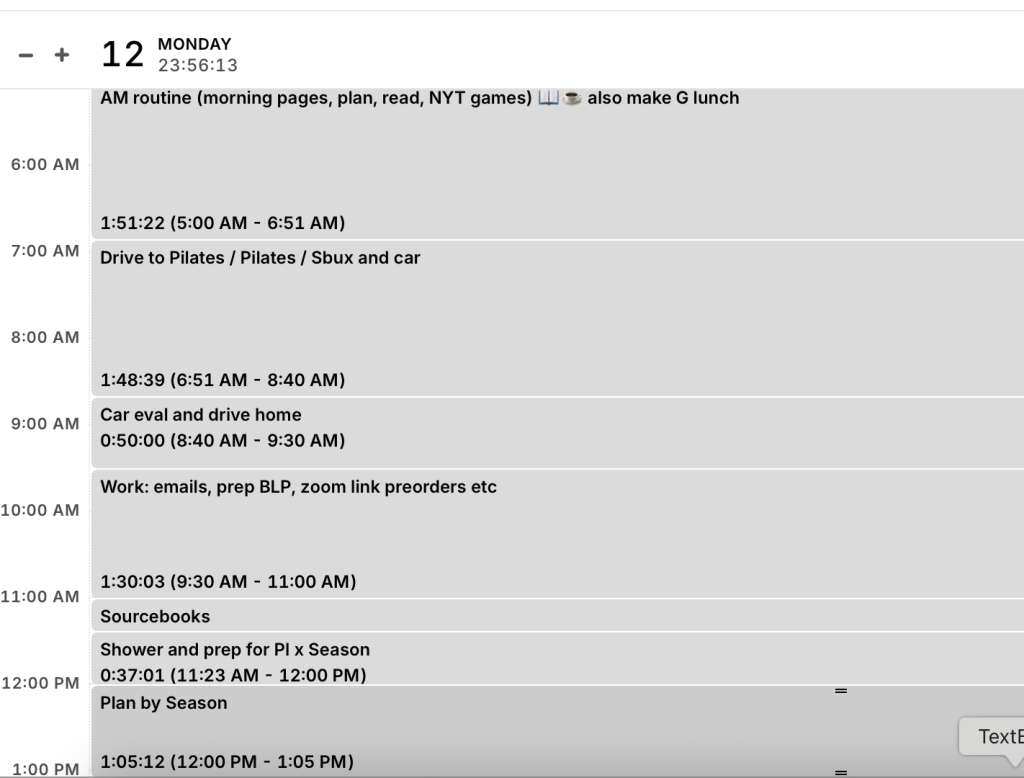 Thank you for the toggl rec!! I’ve been using it for about a month-ish and it’s been very interesting. I also spend a decent amount of time in the car which I do not love but also see no way around (DMV traffic, kid activities). I can’t yet decide what I’m going to DO with the info that I’m learning but it is enlightening and feels like it could be ammunition for change – just not sure what.