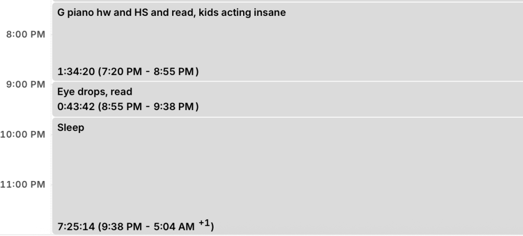 - As noted, in the evening the kids were indeed acting insane — C didn’t have any sports and I don’t think he got enough outside time. (A was at dance and the G/C combination is always . . . active.)