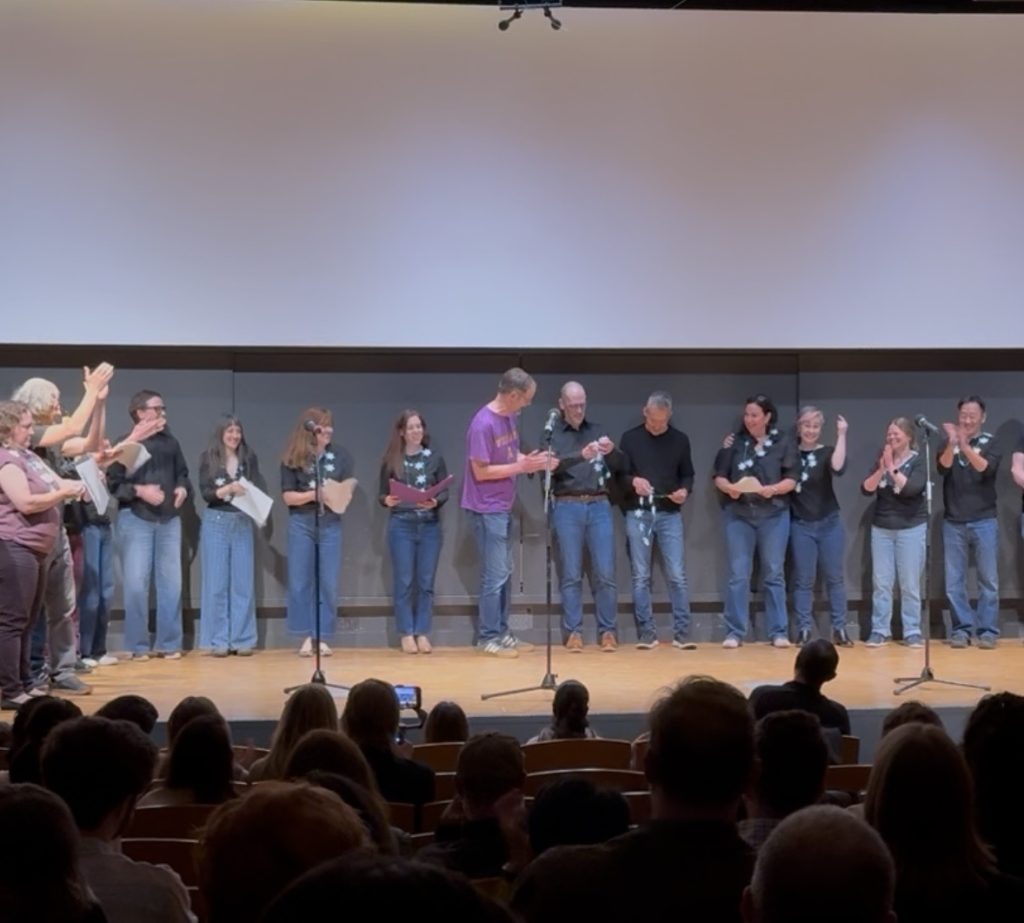 Because Kristen Anderson Lopez, the songwriter (cowriting with her husband), WAS IN THE EPHLATS several years before I joined. WHO KNEW? (not me). This is kind of a big deal and while that sounds intimidating she was very normal and awesome. I did manage to tell her that my Frozen-era children had all of her songs on repeat for years! We sang the Pentatonix arrangement and sounded . . . decent!? Here is a pic of us on stage: